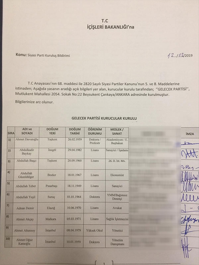 Davutoğlu´nun kurucuları arasında yer aldığı partinin kuruluş dilekçesi bugün İçişleri Bakanlığı´na verildi. Yargıtay Cumhuriyet Başsavcılığına da gönderilen Kurucular Kurulu listesinde 154 isim yer aldı. ?Gelecek Partisi? adlı partide, Erzurum´dan Ayşe Serap İnan, Eski Bursa Valisi İzzettin Küçük, Ufuk Karcı ve Zekayi Doğan´ın adı yer aldı.