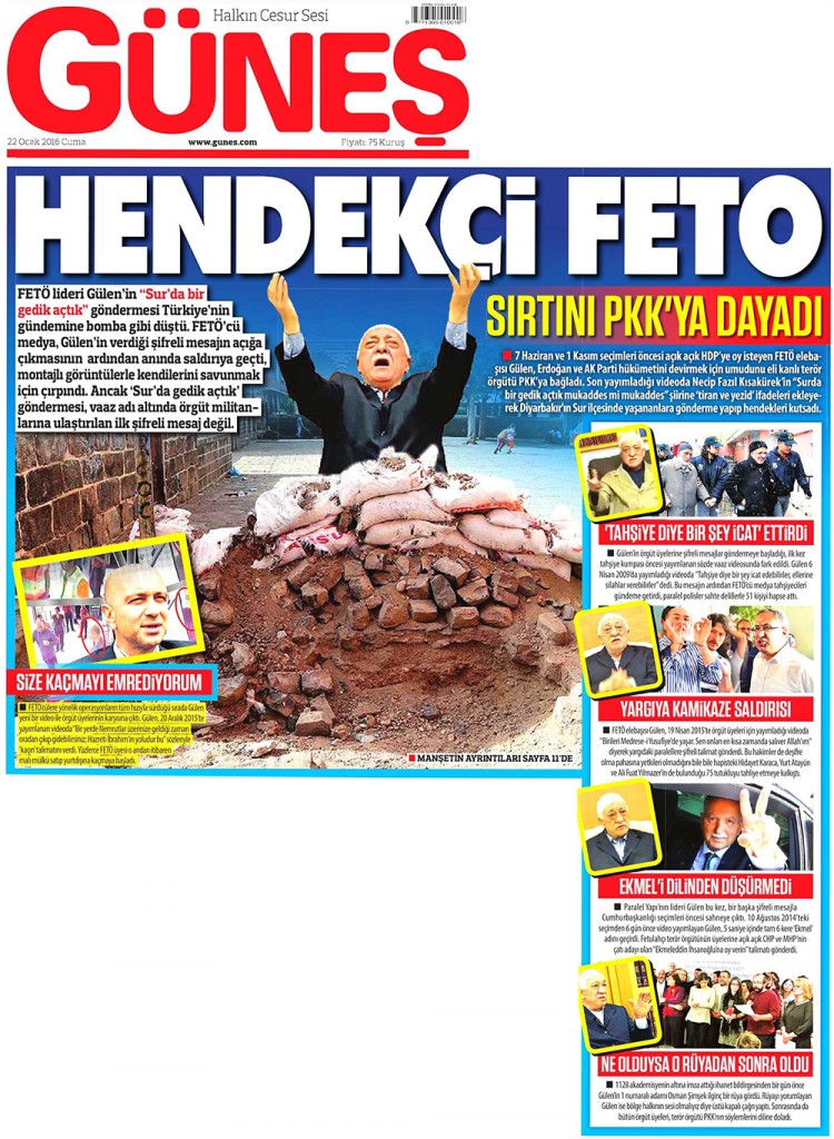 Pensilvanya´daki malikanesinden Türkiye´deki örgüt üyelerine haftalık yayınladığı videolar üzerinden talimatlar gönderen FETÖ elebaşı Fetullah Gülen, son mesajıyla kan dondurdu. Güvenlik güçlerinin PKK´lı teröristlere yönelik operasyonlar düzenlediği Diyarbakır´ın Sur ilçesine atıfta bulunan FETÖ elebaşı, ?Sur´da bir gedik açtık. Zafer yakındır? sözleriyle hainlere arka çıktı. FETÖ´nün skandal göndermesinin deşifre olan mesajı büyük tepki topladı. Alelacele harekete geçen FETÖ´cü medya saldırıya geçti, montajlı görüntülerle kendilerini savunmak için çırpındı. Ancak ?Sur´da gedik açtık´ mesajı vaaz adı altında örgüt militanlarına gönderilen ilk şifreli mesaj değil.