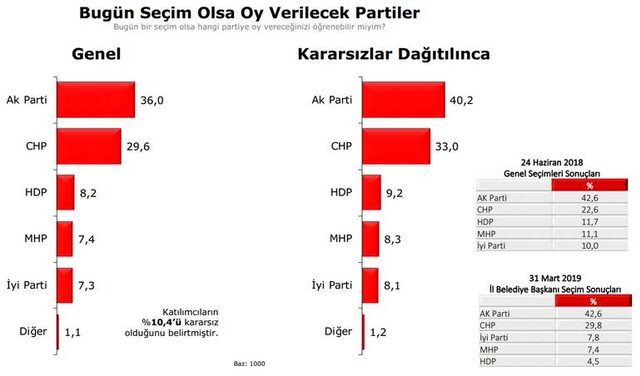 ´Türkiye´de bugün bir seçim olsa oyunuzu kime verirsiniz?´ sorusuna katılımcıların, kararsızlar (%10,4) dağıtıldıktan sonra, yüzde 40,2´si AK Parti,yüzde 33´ü CHP, yüzde 9,2´si HDP, yüzde 8,3´ü MHP, yüzde 8,1´i ise İyi Parti yanıtını verdi. Araştırma sonuçlarına göre, ´Son bir yılda yaşanan ekonomik gelişmeler sizi nasıl etkiledi?´ sorusuna toplumun yüzde 46,5´i ekonomik olarak daha kötüye gittiğini belirtirken, yüzde 19,4´ü hiç etkilenmediği şeklinde cevap verdi. 2018 yılında kendi ekonomik olarak daha kötü durumda görenlerin oranı yüzde 57,1´di.
