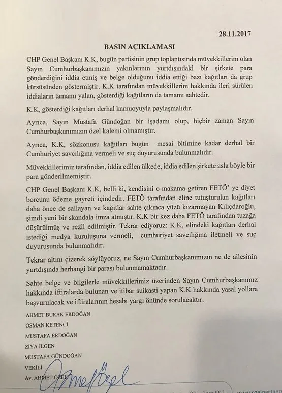 Avukat Ahmet Özel şu açıklamayı yaptı: "CHP Genel Başkanı K.K , bugün partisinin grup toplantısında müvekkillerim olan Sayın Cumhurbaşkanımızın yakınlarının yurtdışındaki bir şirkete para gönderdiğini iddia etmiş ve belge olduğunu iddia ettiği bazı kağıtları da grup kürsüsünden göstermiştir. K.K tarafından müvekkillerim hakkında ileri sürülen iddiaların tamamı yalan, gösterdiği kağıtların da tamamı sahtedir. Kılıçdaroğlu, gösterdiği kağıtları derhal kamuoyuyla paylaşmalıdır.